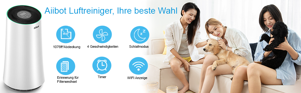 Aiibot air purifier filters the room air and effectively eliminates allergy, smoke, dust, fragrance, odours, mould and bacteria.